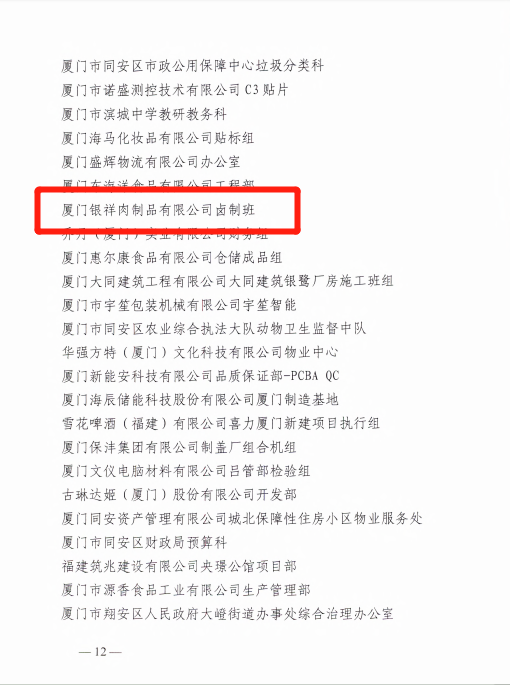 2023年1月以來,廈門銀祥集團(tuán)有限公司工會組織以習(xí)近平新時代中國特色社會主義思想為指導(dǎo),一直積極參與“五一先鋒號”爭創(chuàng)活動。為進(jìn)一步增強新時代工人階級的自豪感和使命感,營造勞動光榮的社會風(fēng)尚和精益求精的敬業(yè)風(fēng)氣,廈門市總工會授予廈門銀祥肉制品有限公司鹵制班廈門市“五一先鋒號”先進(jìn)集體稱號。
